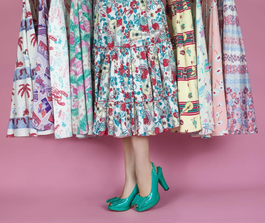 At Bettie Page, we share a love for these fantastic nostalgic prints. We are continuously inspired by the fun prints of the past, and we design and produce all of our new custom prints in-house, doing our best to stay true to the color schemes and aesthetic of the past. Check out some of our prints in the header photo!