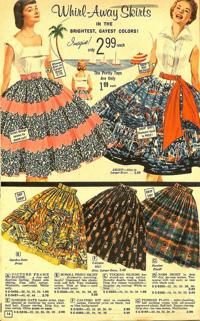 During the post-war boom, the use of feedsack fabrics for clothing declined as consumers began purchasing more off the rack clothing and fabric. In response, goods manufacturers began selling their products in cheaper paper packaging which was no longer suitable for making clothing. The demand for interesting prints, however, did not go away. Fashion adapted to meet the demand that had been created, creating new prints that were more playful, colorful and plentiful–the more kitsch, the better! In addition to floral prints, many new prints were travel-based using themes like Hawaiian, Western, or South of the Border motifs. Local fabric stores had racks of border prints for sew-at-home projects. Prints were everywhere, including on the full skirts and dresses filling the Montgomery Ward catalog, and home décor items such as table cloths, aprons and curtains.