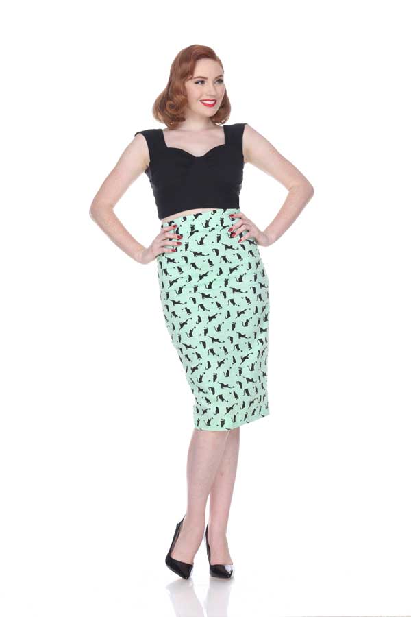 Are you a gal who must have a bold pattern in your life at all times? Then the Kitty Kat High Time skirt is in your future! An adorable mint green adorned with the silhouette of cats, this skirt pairs very well with our Bettie top in black. Keeping with this playful theme, match with our Niley sandals so that you can go all day long with this fun and flirty outfit!